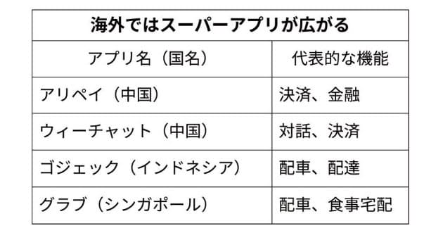 ▼スーパーアプリ 対話や配車、決済など日常生活で使うサービスを一括で提供するアプリのこと。決済サービスを軸に金融全般に機能を拡大する中国の「アリペイ」や、配車アプリを起点に機能を拡大したインドネシアの「ゴジェック」などが有名だ。米ライドシェア大手のウーバーテクノロジーズの「ウーバー」などもスーパーアプリを目指す。